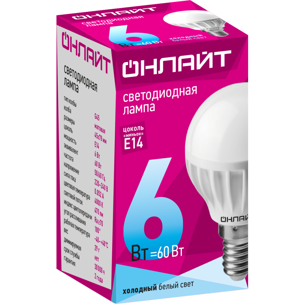 Лампа-LED E14 6W G45 4000К 470Lm 230V шар ОНЛАЙТ (10/100)