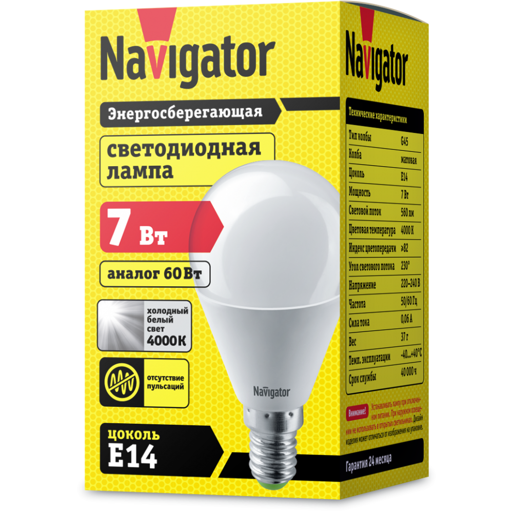 Лампа-LED E14 7W G45 4000К 560Lm 230V шар матовый Navigator (10/100шт)