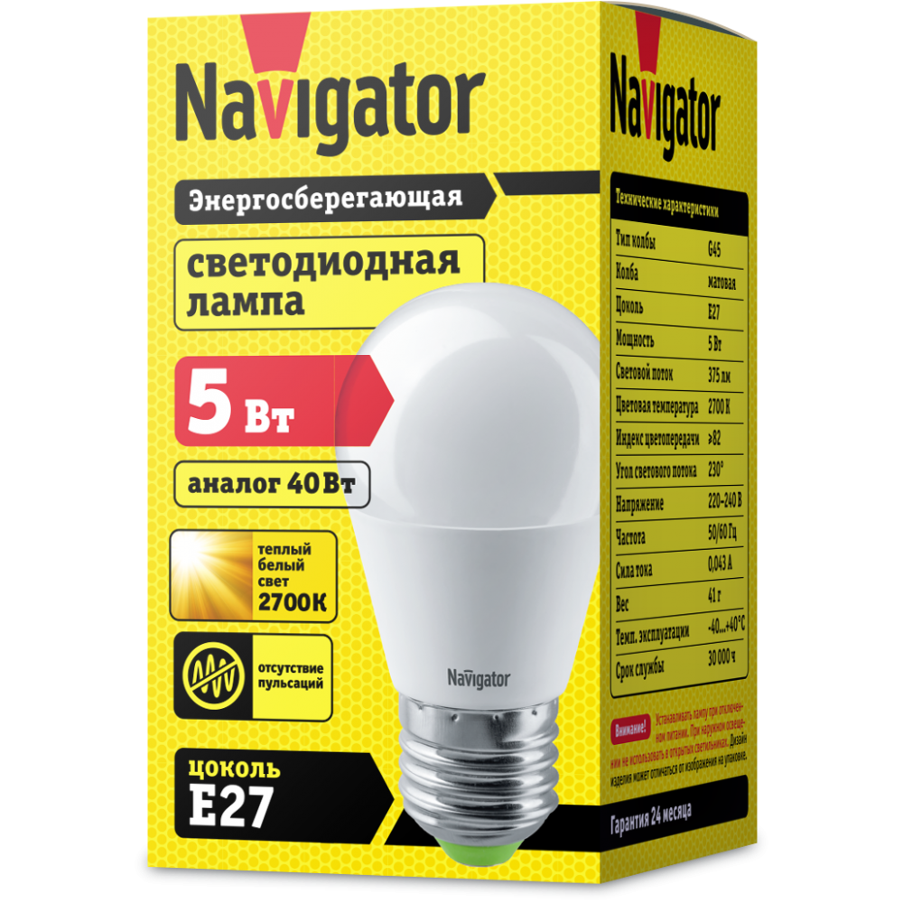 Лампа-LED E27 5W G45 2700K 330Lm 230V шар матовый Navigator (10/100)