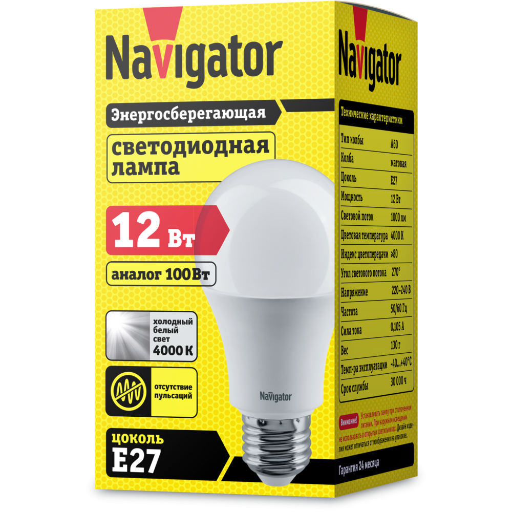 Лампа-LED E27 12W A60 4000K 1000Lm 230V Navigator (10/100)