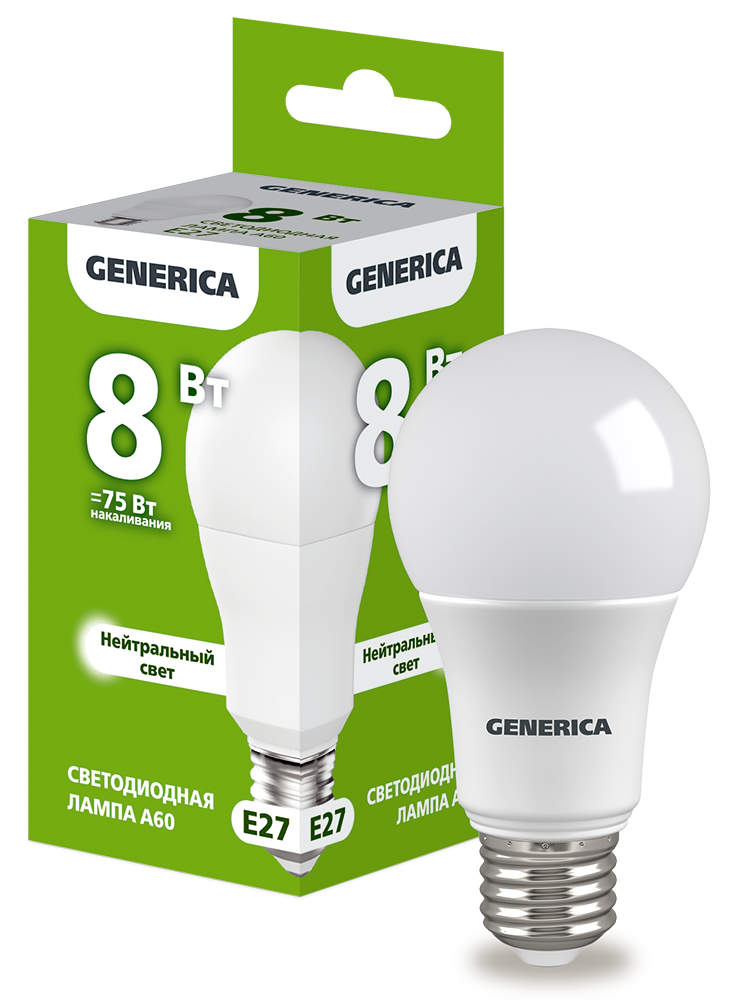 Лампа-LED E27 8W A60 4000K 800Lm GENERICA (10/100)