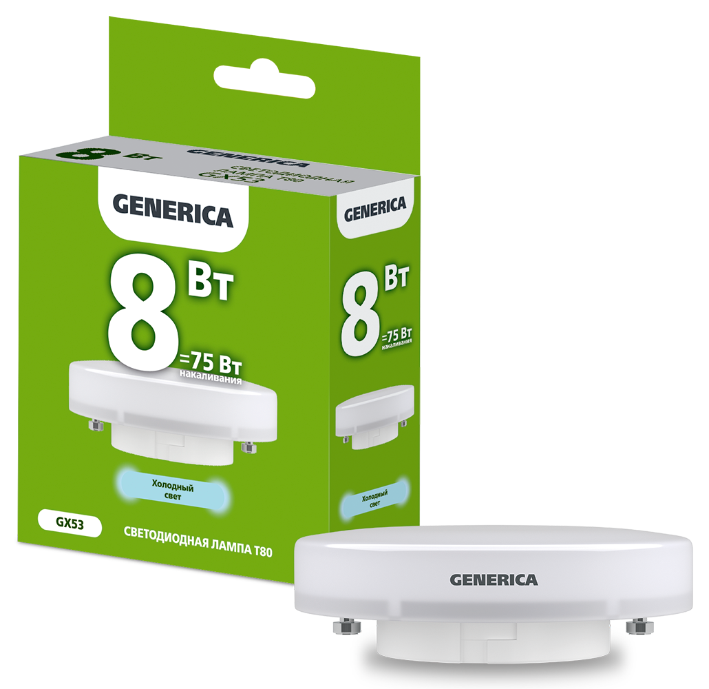 Лампа-LED GX53 8W 6500K 800Lm 230V T80 GENERICA (10/100)