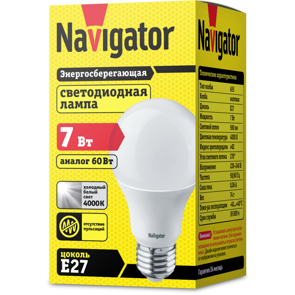Лампа-LED E27 7W A60 4000К 560Lm 230V груша матовая Navigator (10/100)