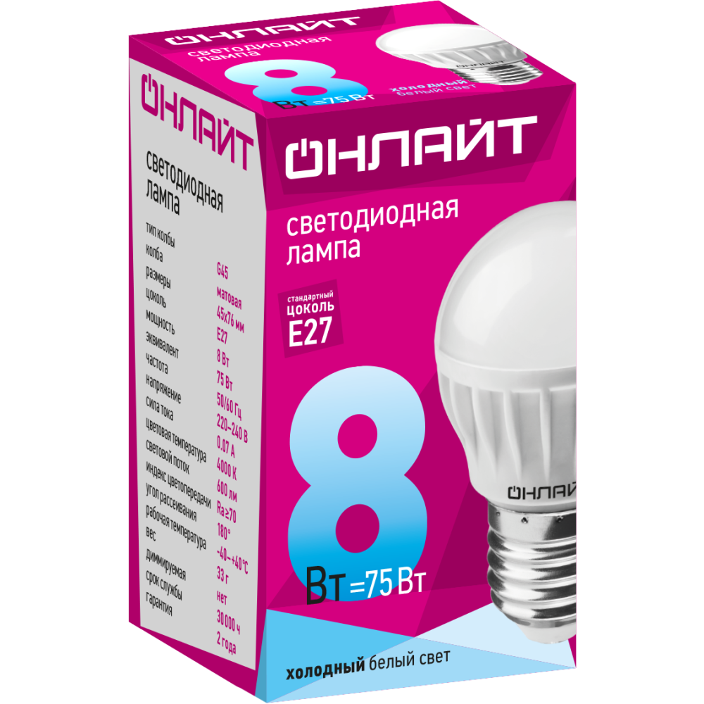 Лампа-LED E27 8W G45 4000К 600лм 230V шар ОНЛАЙТ (10/100)