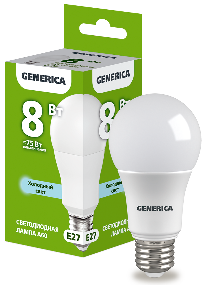Лампа-LED E27 8W A60 6500K 800Lm GENERICA (10/100)