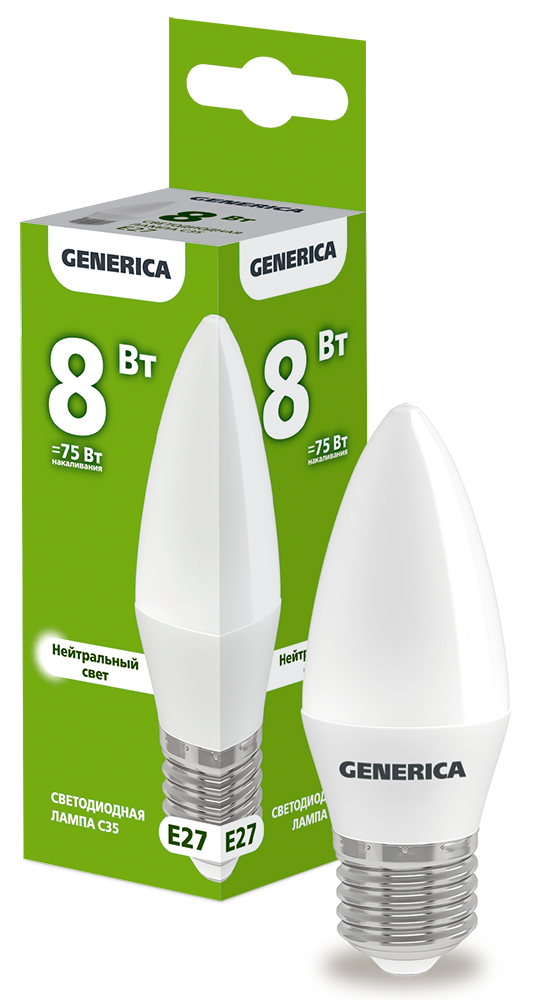 Лампа-LED E27 8W C35 4000K 800Lm GENERICA (10/100)