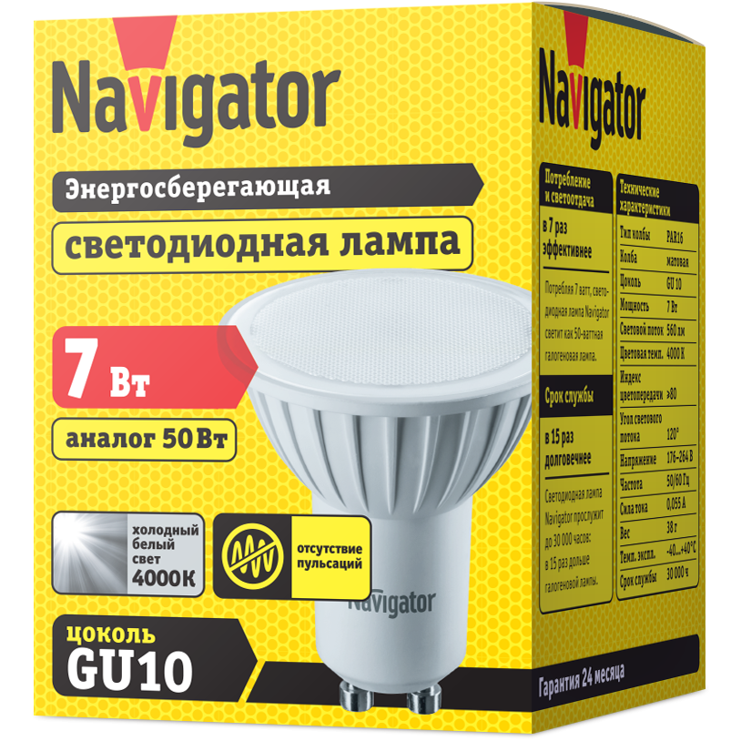 Лампа-LED GU10 7W 4000К 560Lm 230V Navigator (20/100шт)