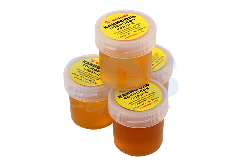 Канифоль сосновая марки А 20 г REXANT предназначена для удаления тонких и нестойких оксидов с поверхности под пайку, улучшения растекания жидкого припоя при пайке печатных плат и радиокомпонентов.