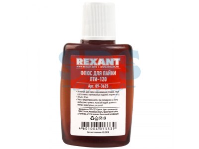 Флюс для пайки ЛТИ-120 30 мл REXANT предназначен для удаления оксидов с поверхности под пайку, улучшения растекания жидкого припоя и защиты от действия окружающей среды при пайке нержавеющих сплавов, меди и её сплавов, оцинкованных изделий, нихрома, свинца, никеля, серебра, кадмия, палладия, висмута.