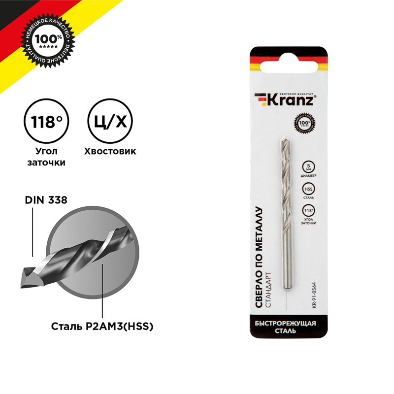 Сверло по металлу 5,0 мм HSS (1 шт. в упаковке) DIN 338 Kranz-заказ
