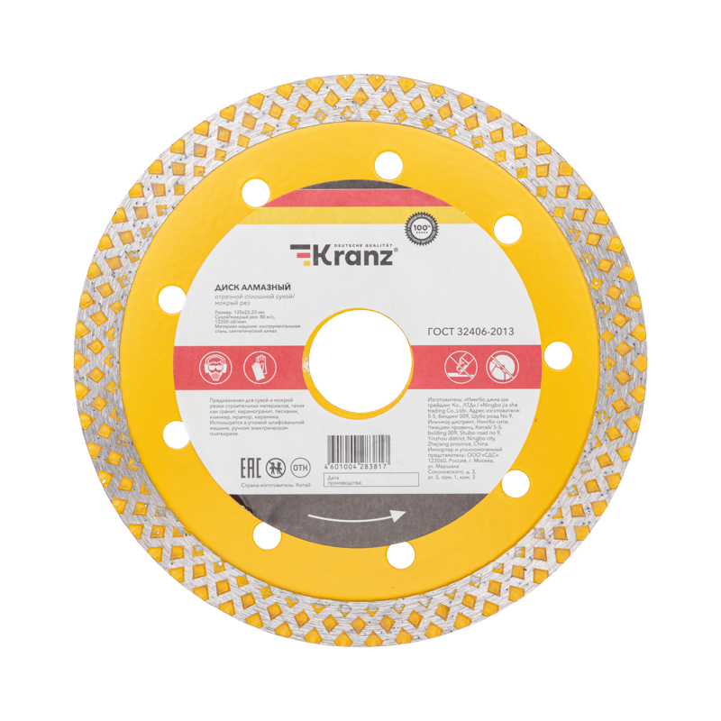 Диск алмазный отрезной сплошной KRANZ предназначен для сухой и мокрой резки строительных материалов, таких как гранит, керамогранит, песчаник, клинкер, мрамор, керамика. Используется в угловой шлифовальной машине, ручном электрическом плиткорезе.