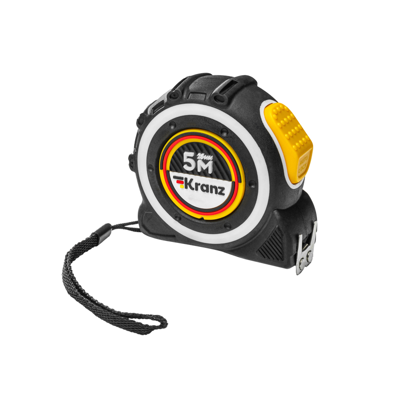 Двухкомпонентный прорезиненный корпус, выполненный из ударопрочного пластика, не скользит в руках. Закаленное двухстороннее толстое полотно может быть вытянуто на большую длину без изломов. Имеет глянцевое лаковое покрытие, которое не стирается со временем. Обладает удобным двухсторонним зацепом с мощными магнитами. Автоматическая лента бесшумно сматывается при нажатии на кнопку.