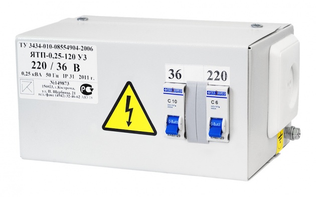 Ящики ЯТП-0,25 У3, однофазные, с естественным воздушным охлаждением, включаемые в сеть переменного тока частоты 50-60 Гц, представляют собой металлический корпус, закрытый крышкой. В корпусе устанавливается трансформатор ОСО-0,25-01, два автоматических выключателя, розетка штепсельная на ток не менее 6 А.