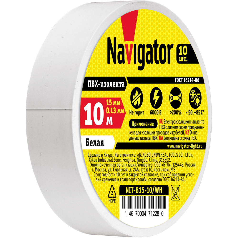 Изолента 15мм/10м белая Navigator (10/300шт.)