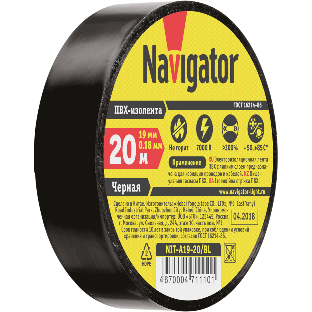 Изолента 19мм/20м черная Navigator (10/200шт)