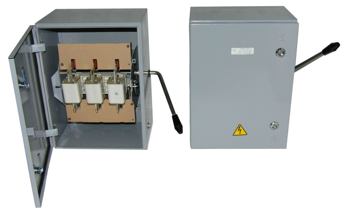 Ящик представляет собой металлический корпус с выпуклой дверцей, в котором закреплен подвижный блок, на котором закреплены предохранители, выполняющие функцию подвижного контакта.