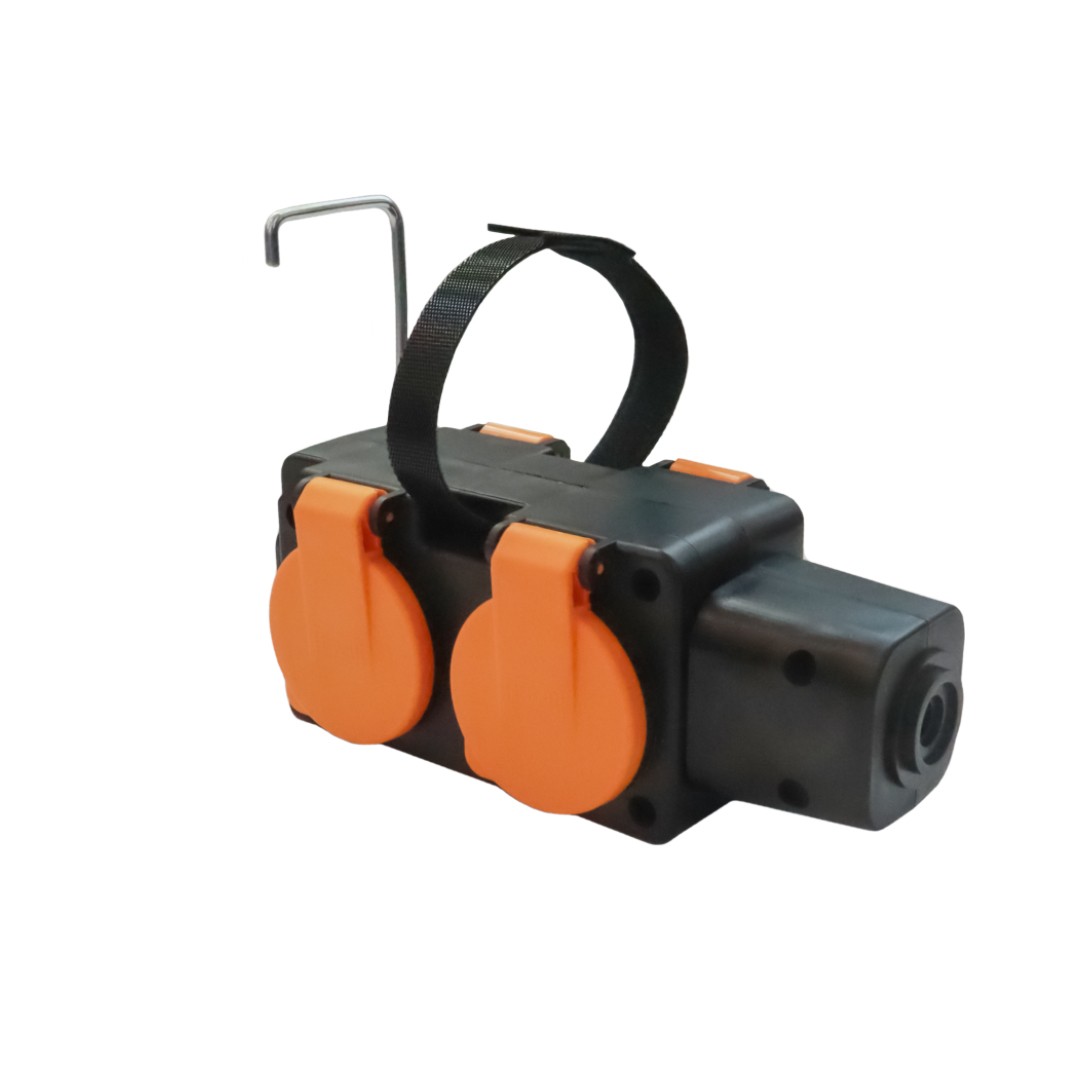 Розетка переносная имеет два крепёжных элемента: в виде металлического крючка и хомута-липучки. Это позволяет удобно использовать устройство на высоте, прикрепив его к ремню электрика-монтажника. Область использования: цеха производственных помещений, строительные площадки, машиностроение, бытовое использование. Крышки надёжно закреплены, обеспечивают защиту от попадания внутрь разъема пыли и влаги. Высокая ударная прочность, в том числе при низких температурах. Подходит для работы в экстремальных условиях. Материал изделия – полипропилен и каучук: