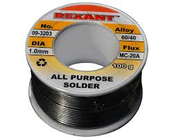 Припой с канифолью REXANT представляет собой проволоку (диаметром 1 мм) из сплава олова (60 %) и свинца (40 %). Используется в пайке для соединения деталей между собой и позволяет создать герметичный, механически прочный (устойчивый) шов. Нагреваясь до температуры плавления (183...188 °C) припой: расплавляется, смачивает спаиваемый металл и, растекаясь по нему — заполняет место между соединяемыми деталями.