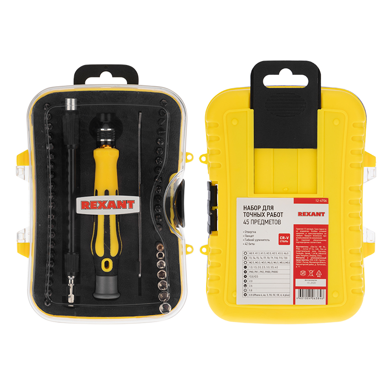 Набор отверток для точных работ REXANT 45 в 1 оптимально подходит для выполнения прецизионных работ в электронике и электромеханике, ремонта телефонов, планшетов, ноутбуков, электронных книг, часов и других популярных приборов, которые используются в быту. Инструменты выполнены из качественной хромованадиевой стали, обладающей высокой прочностью к механическим повреждениям и образованию ржавчины.