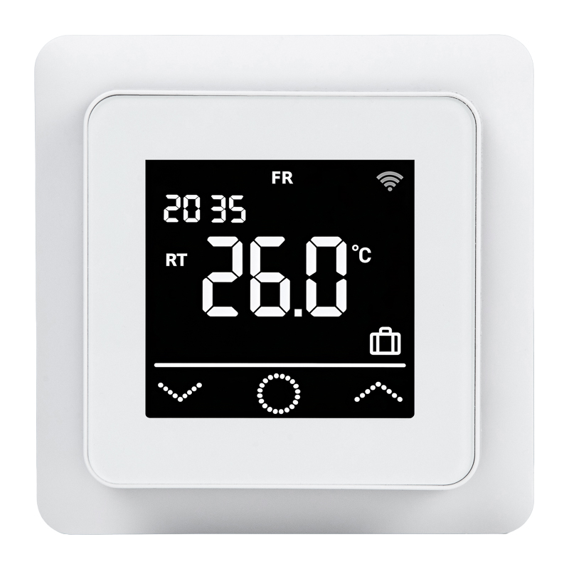 Терморегулятор выполнен в строгом и минималистичном дизайне. Может быть встроен в популярные серии электроустановки, внутренний размер которых составляет 55х55 мм.