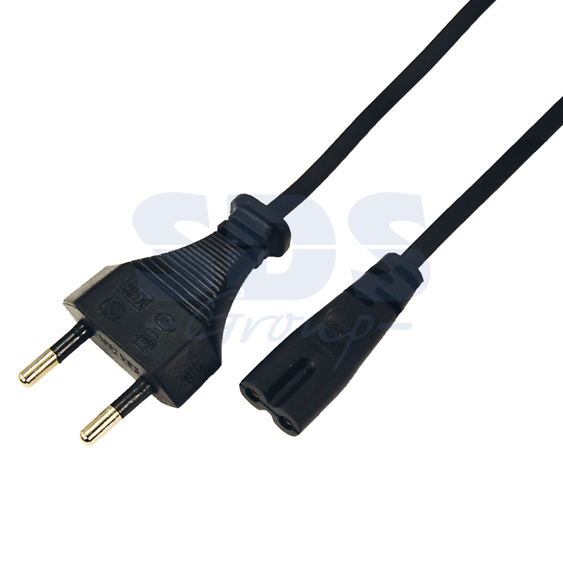 Шнур сетевой 1.5 м 2x0.5 мм? предназначен для подключения к сети переменного тока (AC) с напряжением 220 B аудио- и видеоаппаратуры, источников питания ноутбуков, игровых консолей и других приборов, имеющих штыревой сетевой разъем типа С8 (известен из-за его формы как «восьмерка»). Данный сетевой шнур (IEC cord) оснащен с одной стороны литой неразборной плоской вилкой (евро), с другой — литым гнездовым неполяризованным разъемом типа C7 (евроразъем) и двухжильным проводом с сечением жил 0.5 мм?.