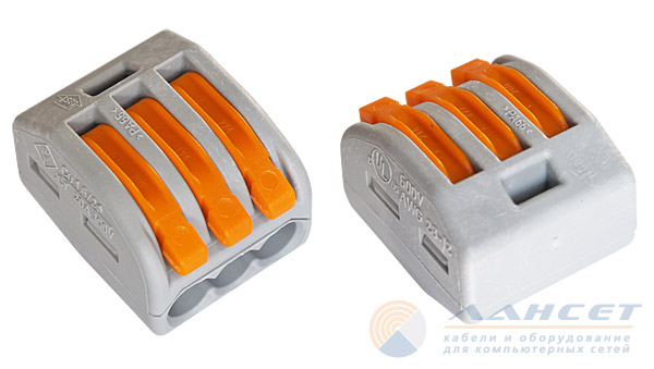 Соединительные клеммы Wago 222 413 с CAGE CLAMP® COMPACT-зажимом захватывают 3 зачищенных тонкопроволочных проводника 2 х 2.5 мм.кв без инструментов.