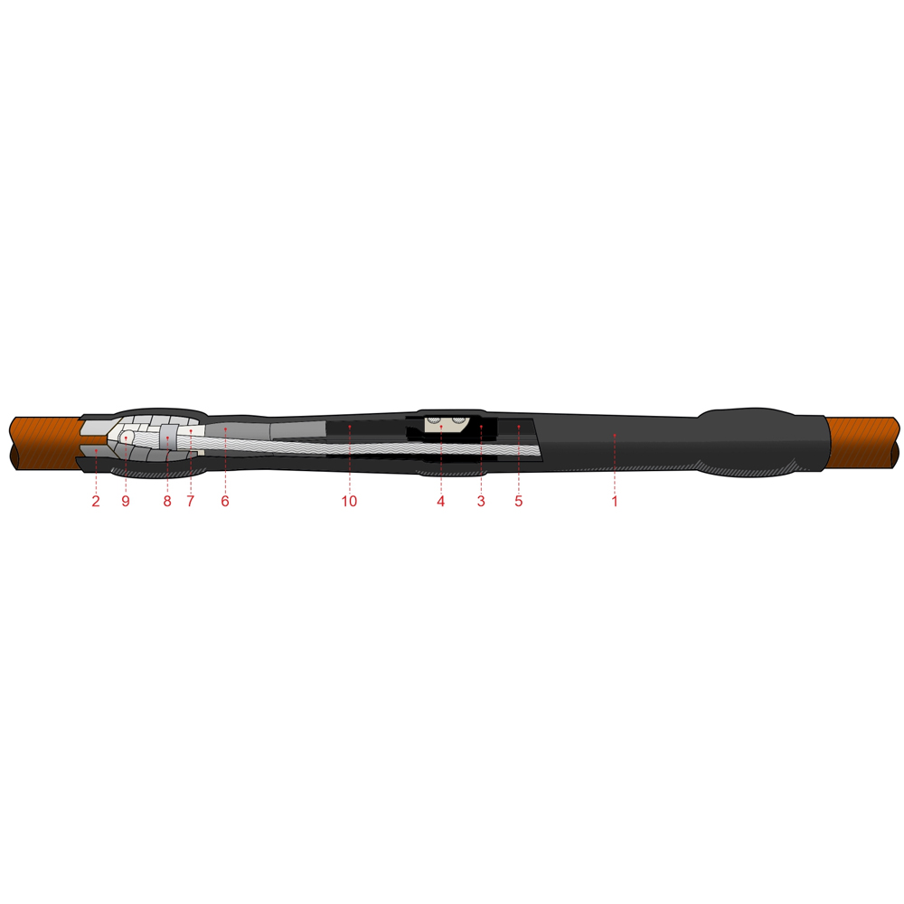Муфта термоусаживаемая соединительная с комбинированным комплектом заземления для кабеля с бумажной изоляцией на напряжение до 1 кВ включительно, с болтовыми соединителями.